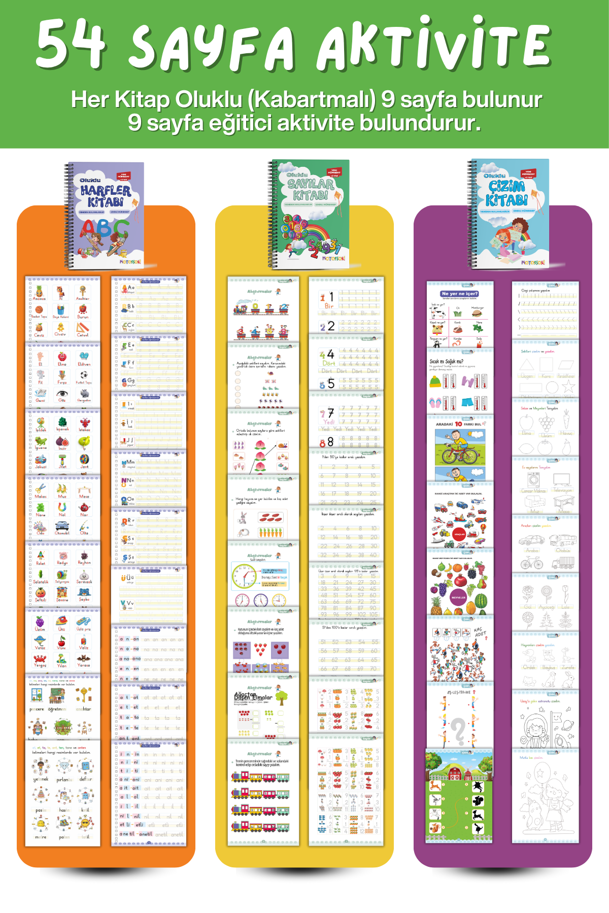 Harfleri | Sayıları ve Çizmeyi Öğreten Oluklu (Kabartmalı) 3’lü Kitap Seti | Sihirli Yazı Defterleri