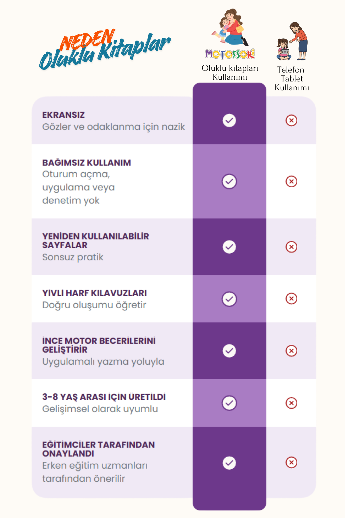 Yaz, öğren, izle... ve yazının kendi kendine kayboluşunun keyfini çıkar! Bu sihirli döngü, çocuğunuzun dikkatini dağıtan silgi ve kağıt israfını ortadan kaldırarak onu tamamen öğrenme anının içinde tutar. Tekrar tekrar kullanılabilen yapısıyla Motossori Sihirli defter kitap setleri, tek bir set ile sayısız defterin yerini tutarak hem aile bütçenize hem de gezegenimize destek olur.